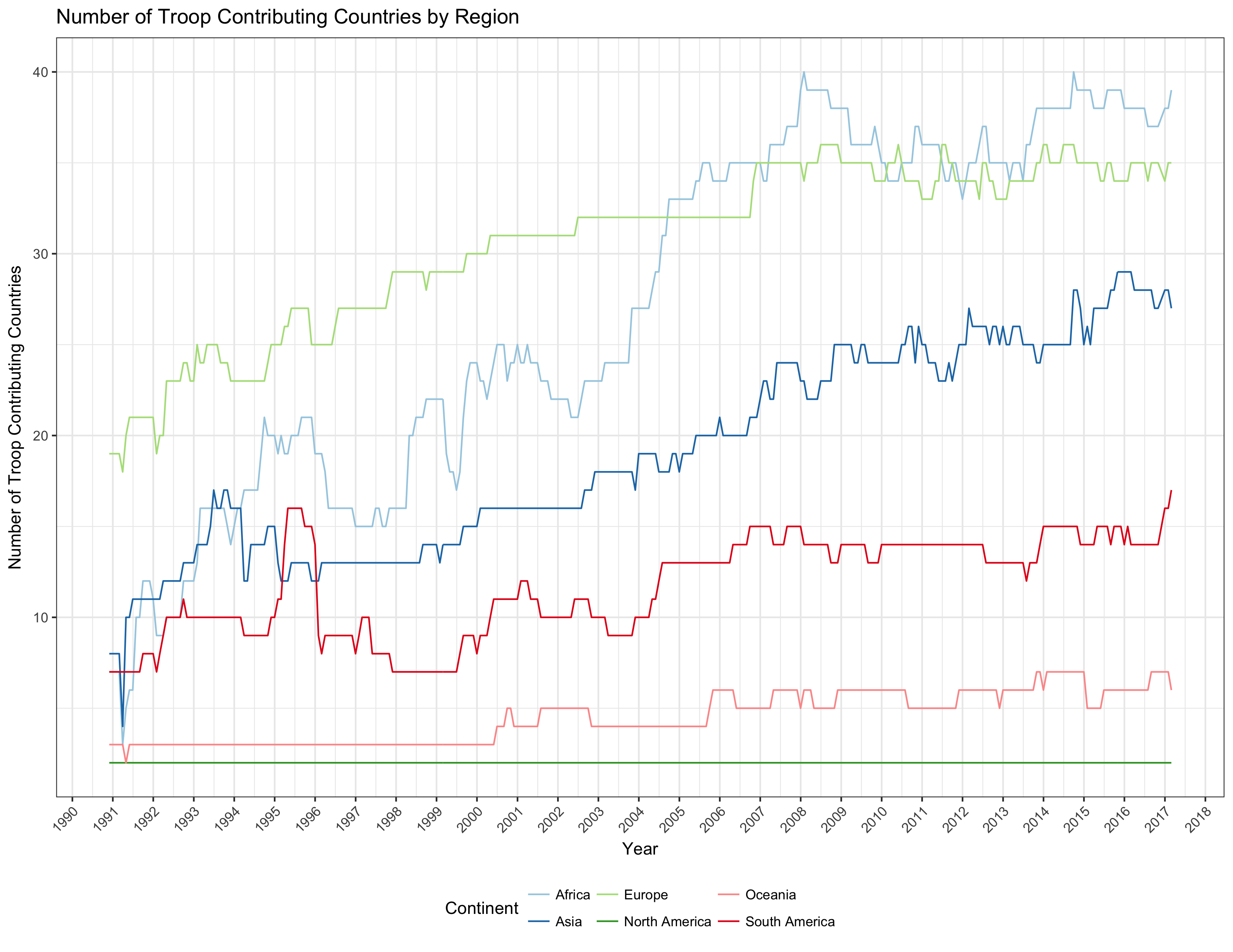 This graph shows the number of troops contributing countries by region between 1990 and 2016. The regions are Africa, Asia, Europe, South America, North America and Oceania.