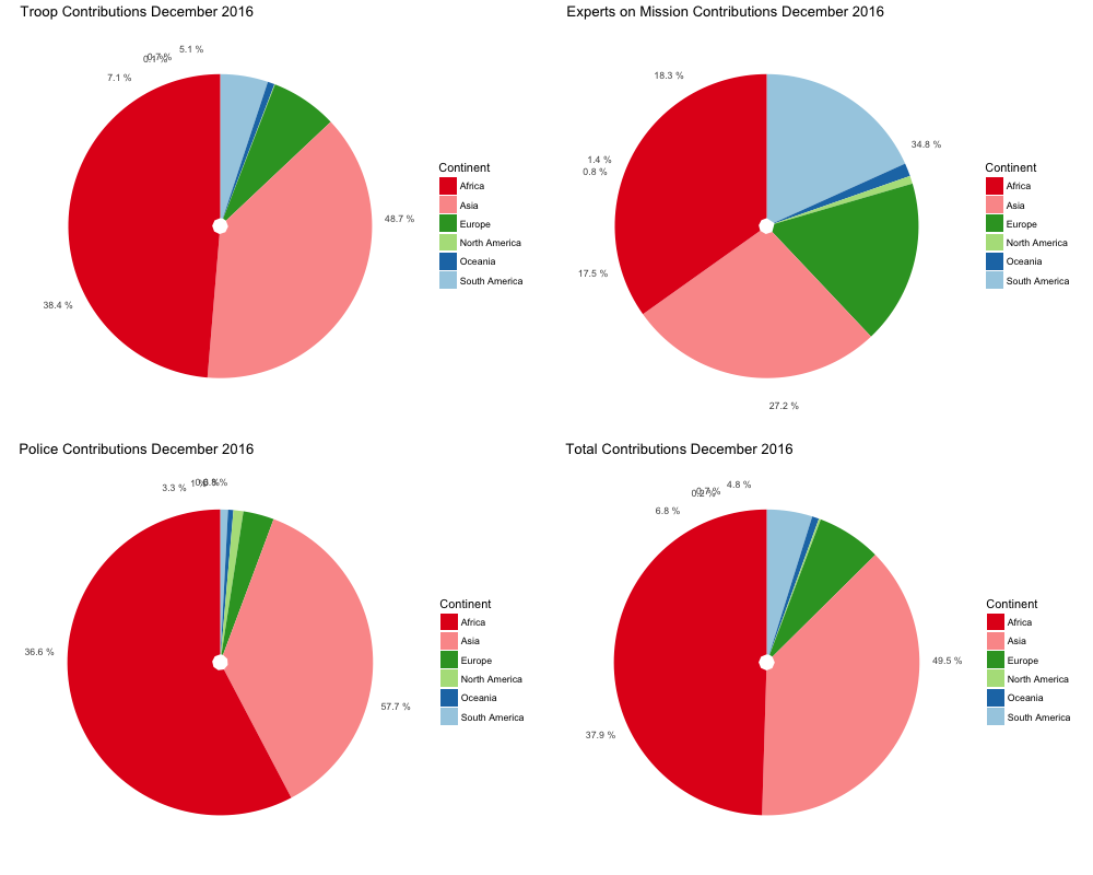 This graphic shows the number of Uniformed UN Peacekeeping Contributions by Region between January 1990 - March 2017. The central regions are Africa, Asia, Europe, North America, Oceania and South America.