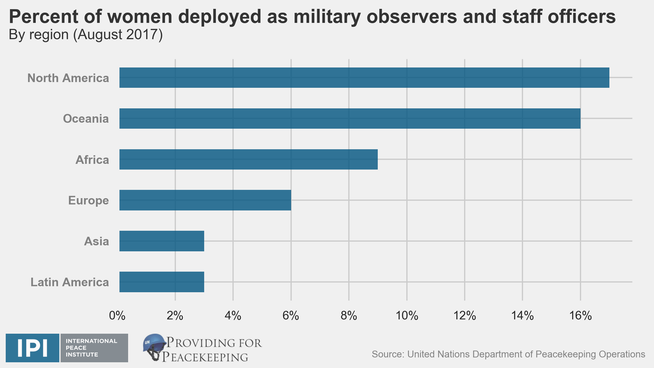 This graph shows the percentage of women who are peacekeeping military observers or staff by region from August 2017. By the end of 2017, the UN has set a target of recruiting 15% women as military observers and staff officers. As of August 2017, the women comprised 6% of all military observers and staff officers. An additional 517 recruits are needed to meet the target goal by the end of the year.