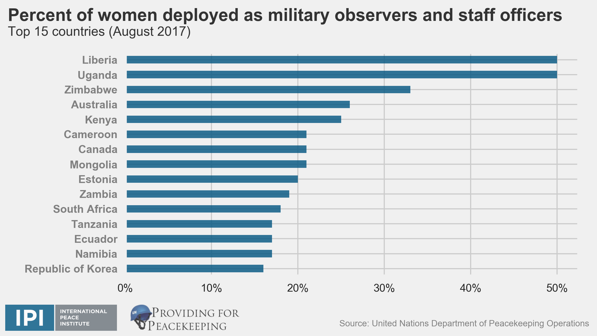 This graph shows the top 15 countries with the highest percentage of women who are peacekeeping military observers or staff from August 2017. 16 countries are meeting the target goal of 15% female military observers and staff (not picture in this graph for space reasons, USA).