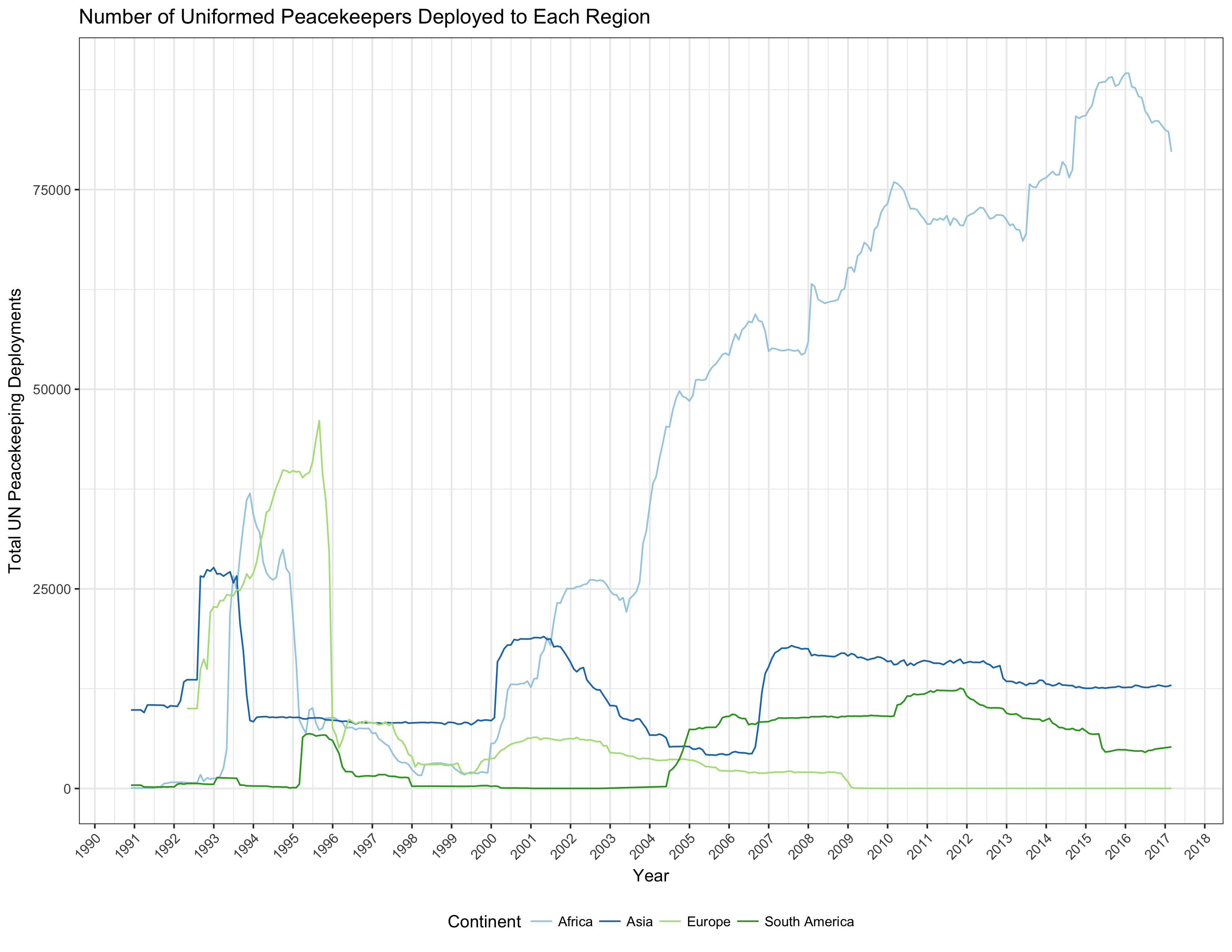 Number of Uniformed UN Peacekeeping Contributions by Region (January 1990 - March 2017)