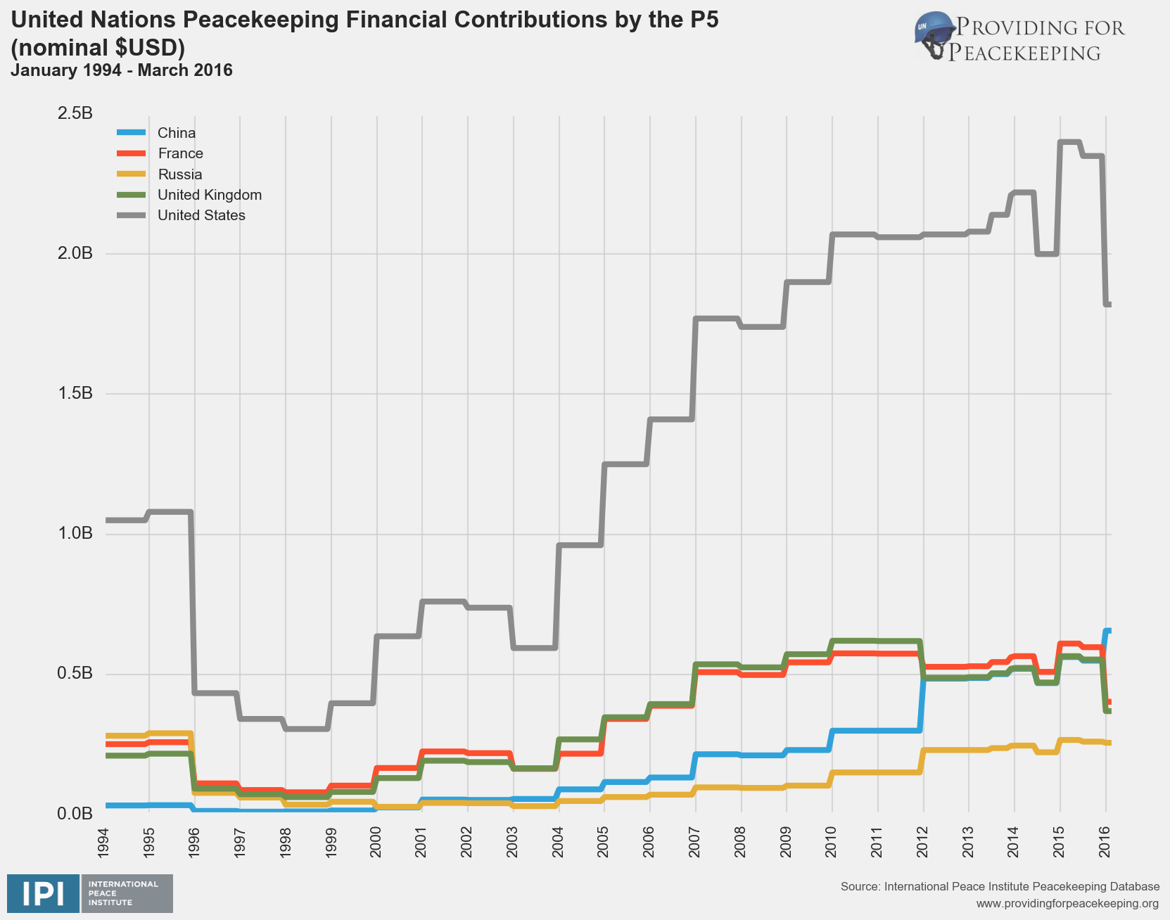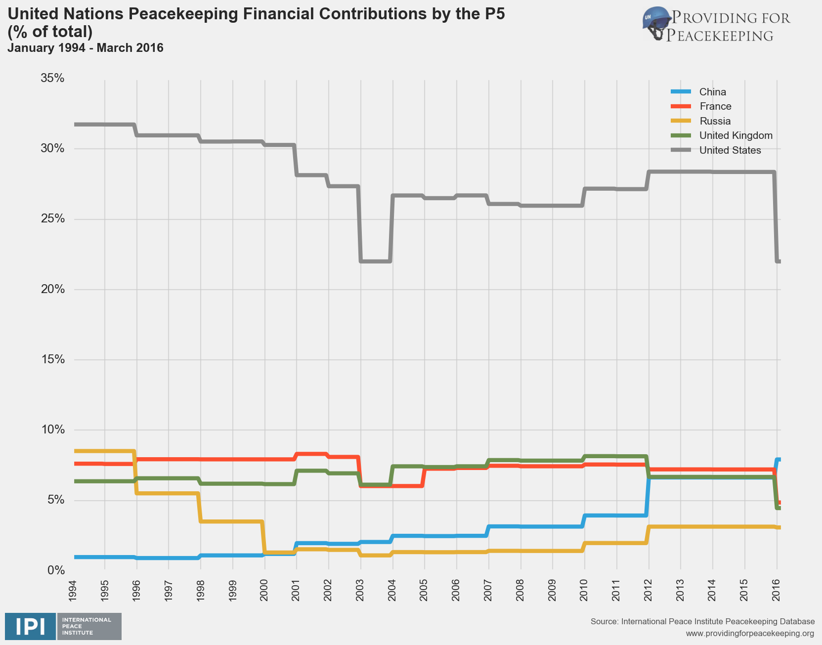 This graphic shows the financial contributions of the P5 as percentages from January 1994 – December 2016. Notably, , the USA, contributes vastly more than any other member of the P5