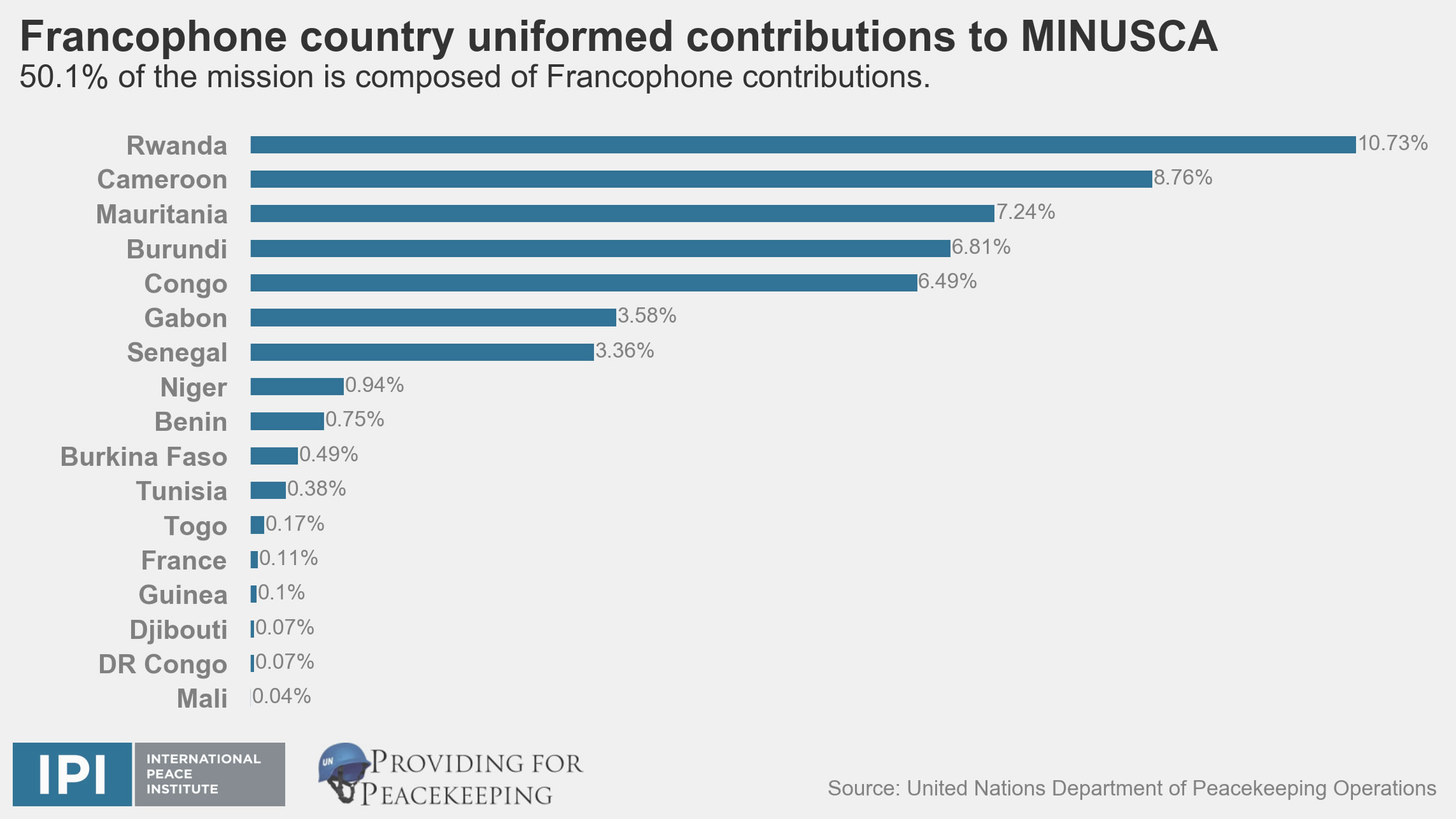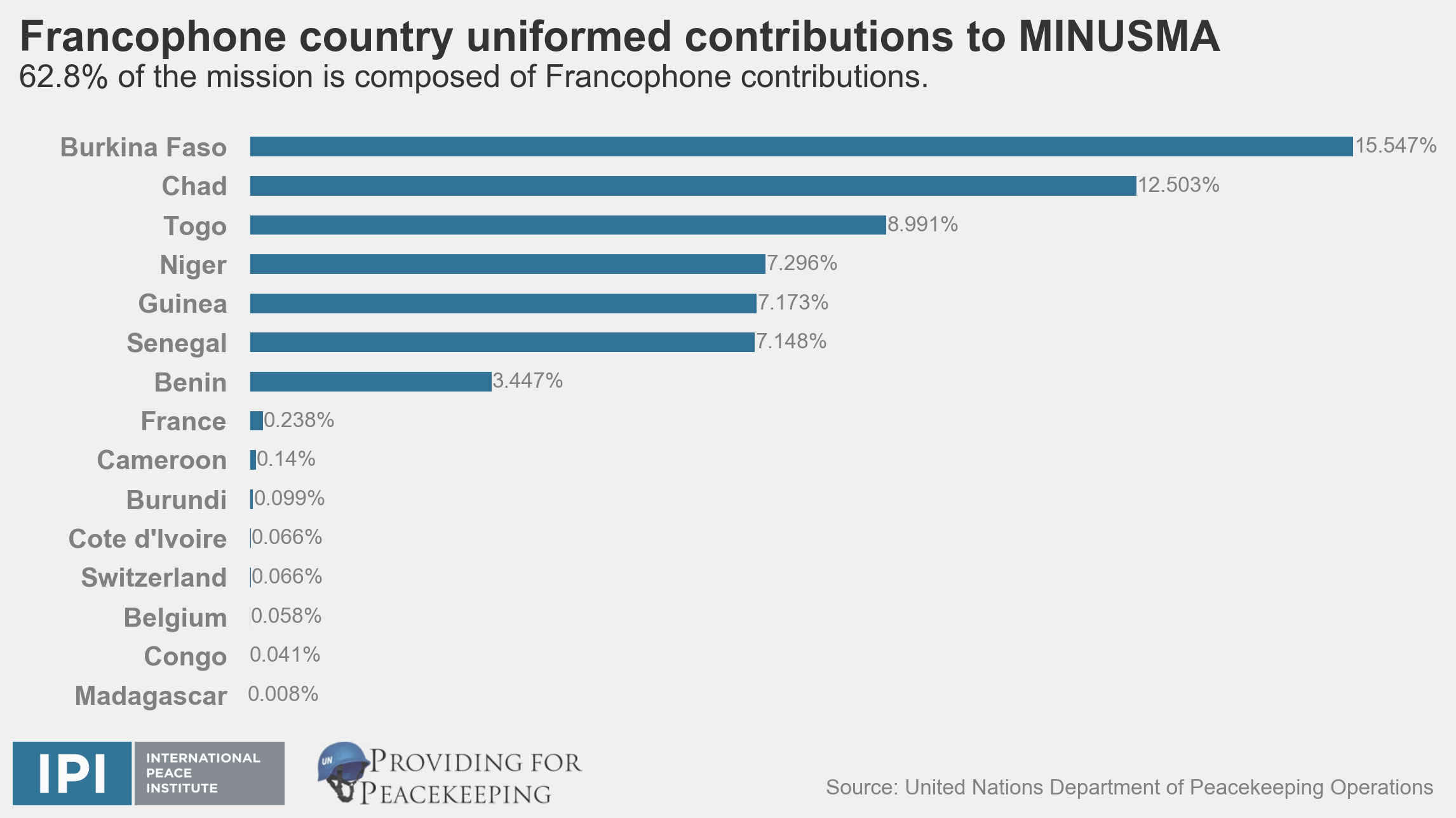 This graph shows Francophone contributions to MINUSMA as of December 2016. MINUSMA has the highest percentage of Francophone contributions to a mission in a Francophone country.